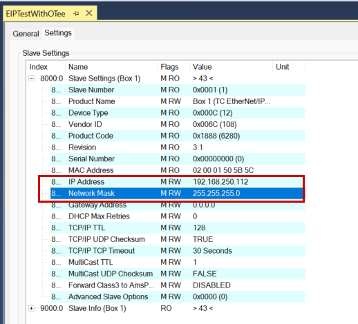 こちらは今回Beckhoff TwinCAT3のEthernet/IP Adapterと接続するために設定したパラメータで、これから一つずつ説明していきます。