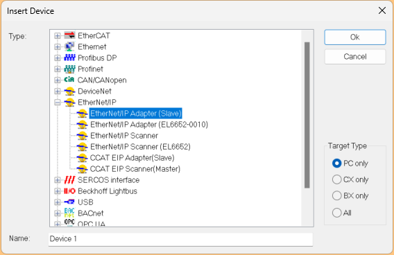 Ethernet/IP→Ethernet/IP Adapter(Slave)を選び→OKで進みます。