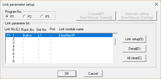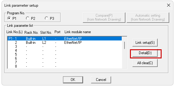 今回はEthernet/IPの接続詳細を設定したいので、P1-1を選択した状態でDetailボタンをクリックします。
