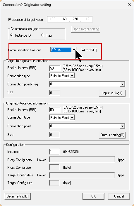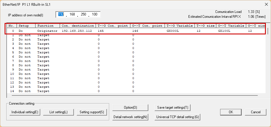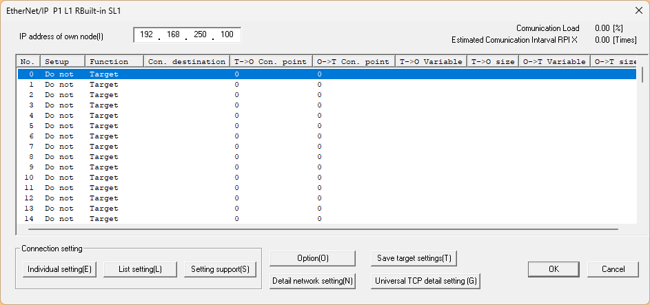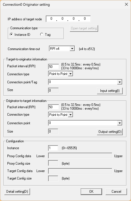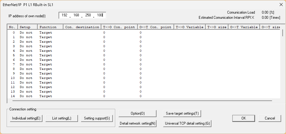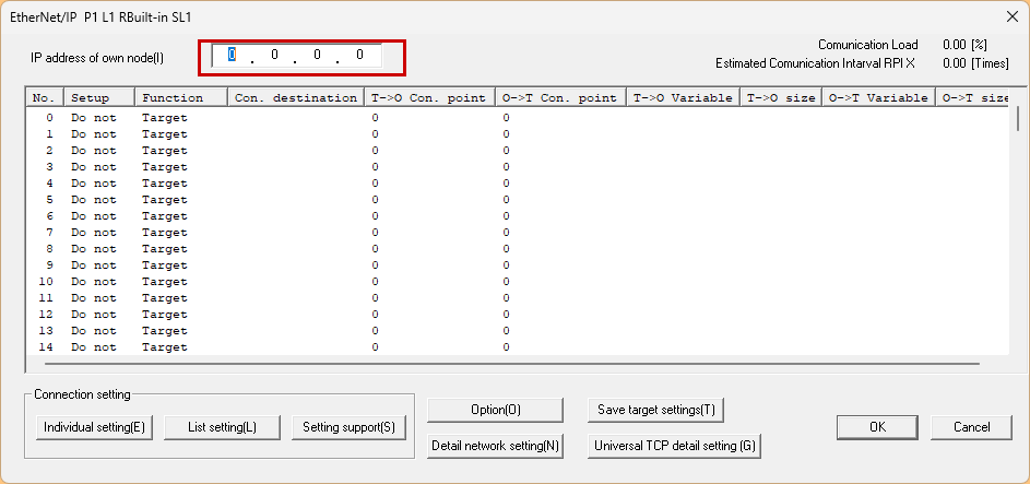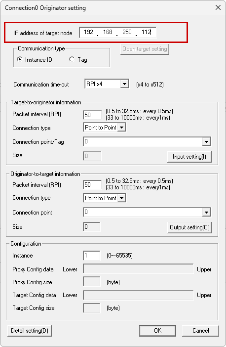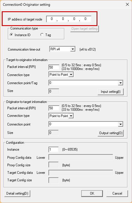 IP address of target nodeは接続先のIPアドレスになります。今回の記事ではBeckhoff TwinCAT3のEthernet/IP Adapterのアドレスになります。