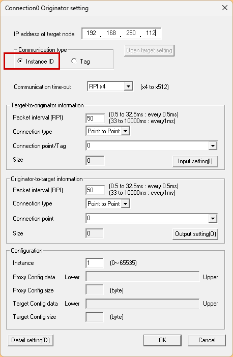 今回の記事ではInstance番号方式でEthernet/IP接続するので、Communication TypeをInstance IDに設定してください。