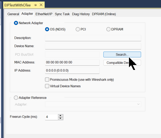 先ほど追加したEthernet/IP Adapter(Slave)をクリックし→Adapter→Searchをクリックします。