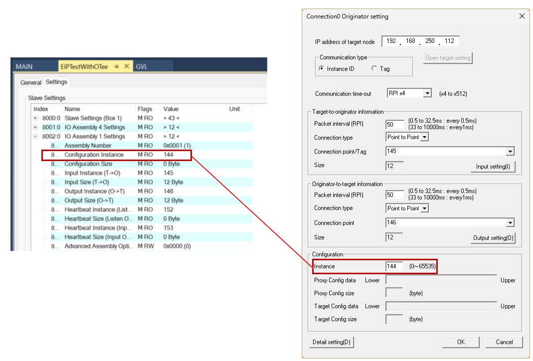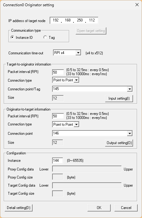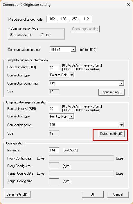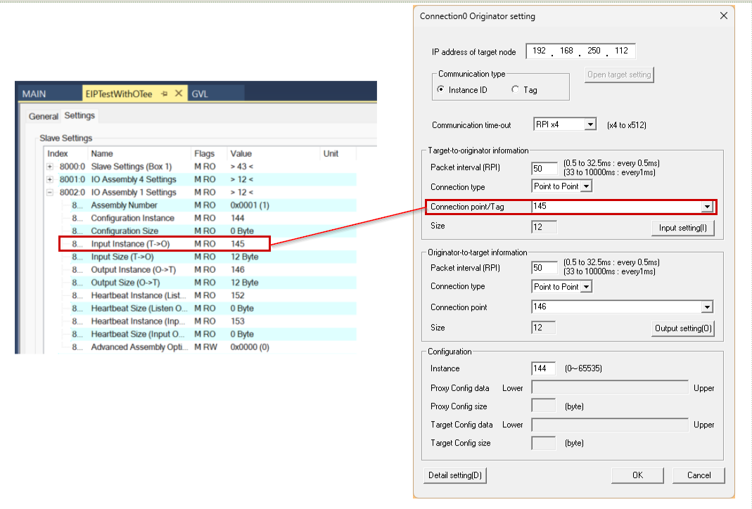 Target-to-origincation informationのConnection point/TagはBeckhoff TwinCAT3のInput instance(T→O)の番号に合わせてください。今回の記事の例では145です。