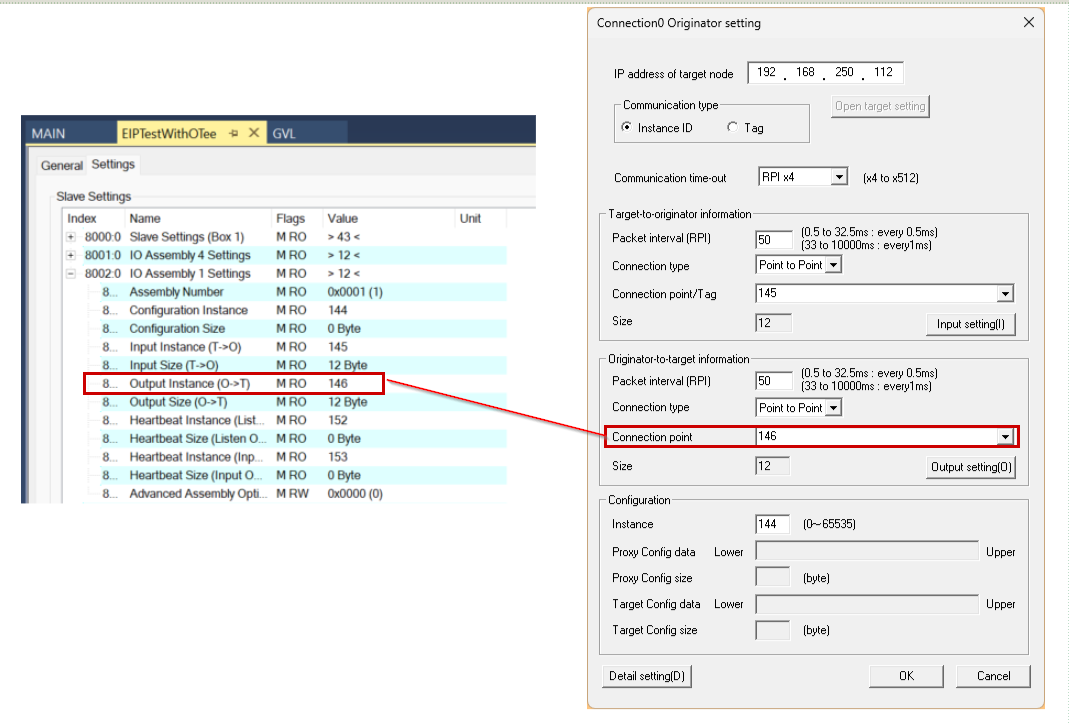 Originator-To-Target informationのConnection point/TagはBeckhoff TwinCAT3のOutput instance(O→T)の番号に合わせてください。今回の記事の例では146です。