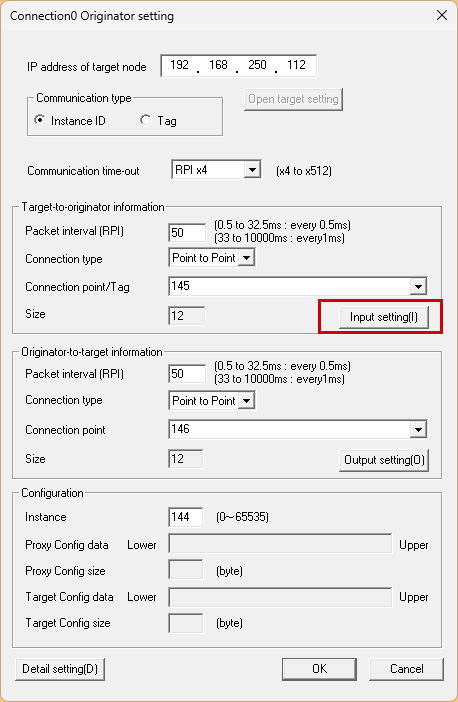 次はTarget-to-origincation informationのデータ交換サイズを設定するため、下図赤枠のInput Settingボタンをクリックします。