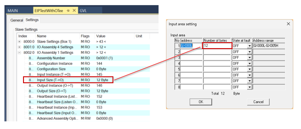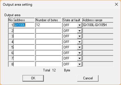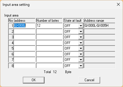 こちらはInput areaの設定画面であり、AddressはEthernet/IP経由で取得した入力データの転送先の先頭アドレス、そしてバイト数です。今回の例ではGX00Lから12Bytesだと設定しました。