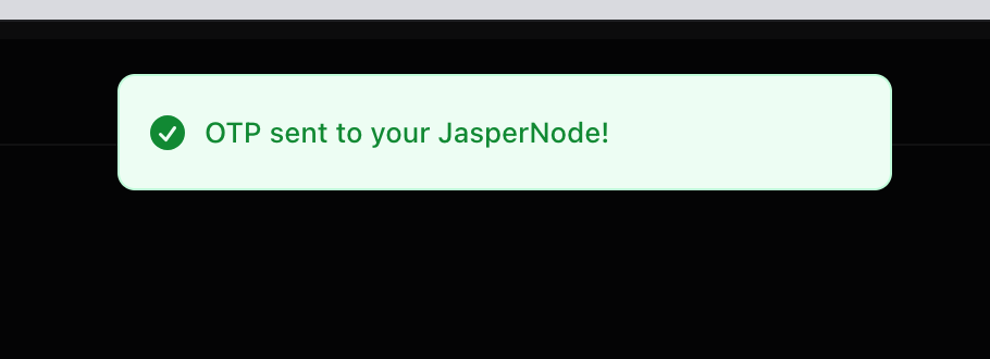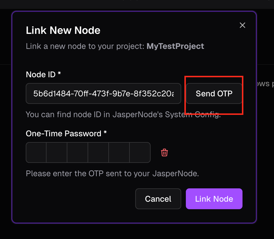 先程JasperNodeの管理ページに戻り、Node IDを貼り付け、Send OTPをクリックします。