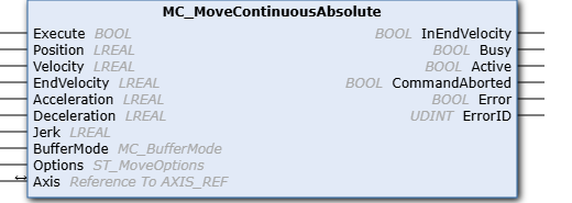 FB MC_MoveContinuousAbsoluteは、絶対目標位置への位置決めを開始し、全移動経路にわたる軸の動きを監視します。目標位置では一定の終端速度に達し、その速度が維持されます。目標位置に到達すると「InEndVelocity」出力が設定されます。それ以外の場合、出力「CommandAborted」が設定されるか、エラー発生時には出力「Error」が設定されます。