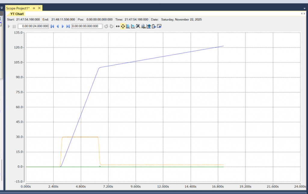 こちらはServoがFBを実行したときのグラフです。軸はMC_MoveContinuousAbsoluteが位置決め完了したあと、EndVelocityの設定値で定速出力してることがわかります。