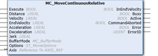 FB MC_MoveContinuousRelativeは、相対距離による位置決めを開始し、全移動経路にわたる軸の動きを監視するために使用されます。目標位置では一定の終端速度に達し、その速度が維持されます。目標位置に到達すると「InEndVelocity」出力が設定されます。それ以外の場合、「CommandAborted」出力、またはエラー発生時には「Error」出力が設定されます。