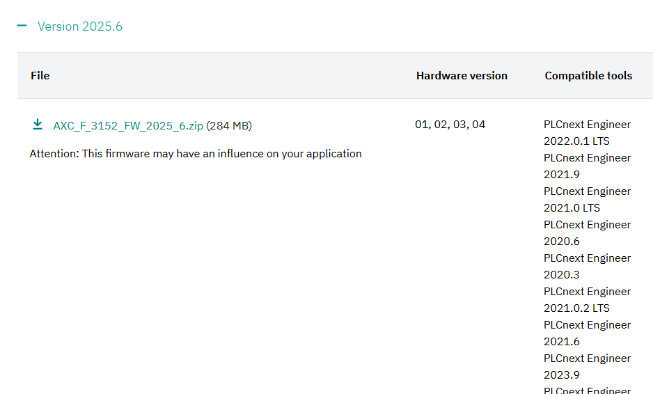 最初に注意しないといけないハードウェアの交換性です。例えば下図ではAXCF3152のFirmware Downloda画面ですが、右では、Hardware Version01,02,03,04だと書いてます。なので2025-6のFWではAXCF3152のHW1,2,3,4にも互換性があります。