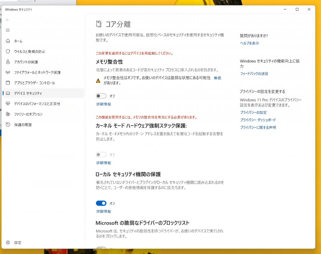 メモリー整合性のオプションをオフし、再起動すればOKです。