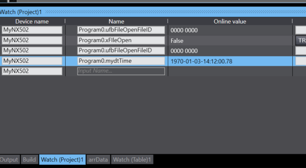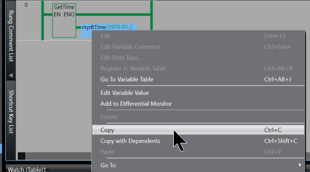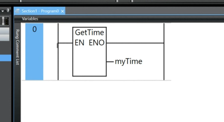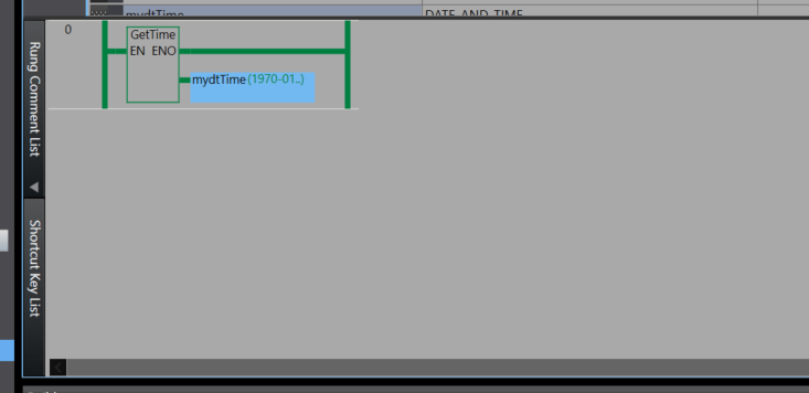 こちらはGetTime関数を使用したラダープログラム例で、常時に現在CPUの時間を読み出し、myTimeというTimeデータ・タイプ変数に格納します。