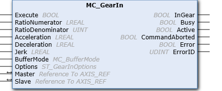機能ブロックMC_GearInは、直線的なマスタースレーブ結合(歯車結合)を有効にします。このFBは、分子/分母形式で固定された歯車比を受け入れます。
