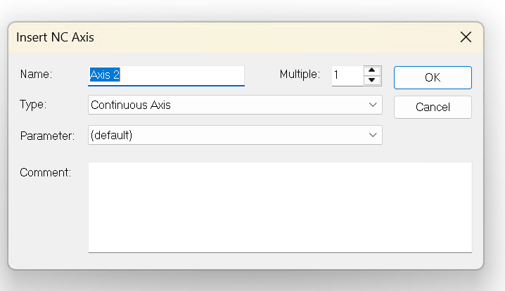 「Insert NC Axis」ダイアログで軸名を設定し→OKで進みます。
