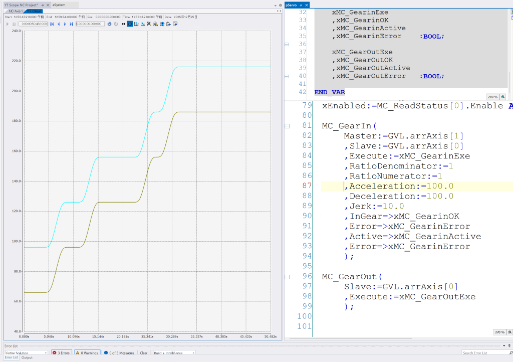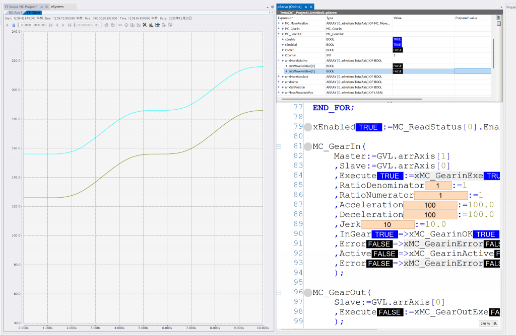 この結果は、Master 軸と Slave 軸が GearIn により同期され、同じ比率で追従動作していることを示しています。