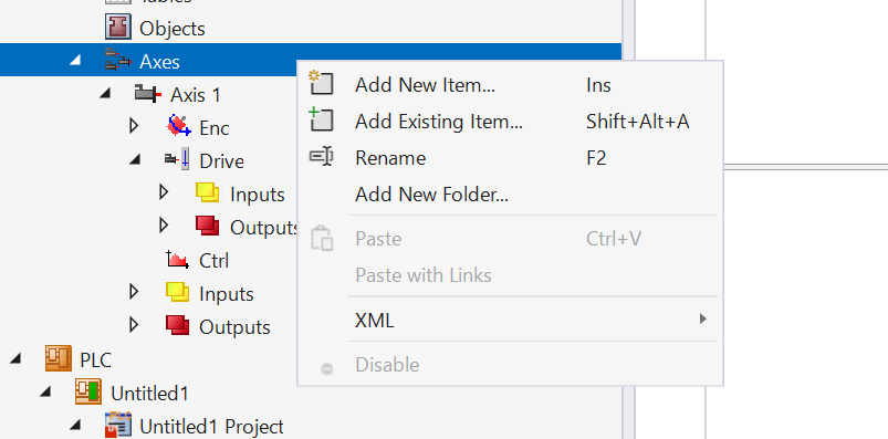 Objects ツリー内の Axes を右クリックし、「Add New Item…」 を選択することで、新しい軸を追加できます。