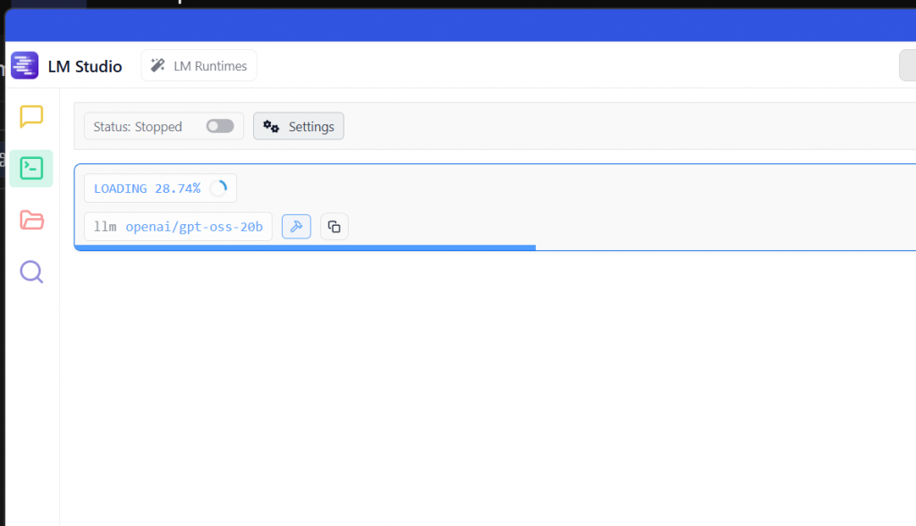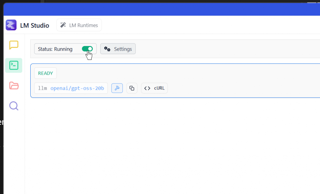 LM Studioにモデルをロード完了したらStatus RunningのRadioボタンをONします。