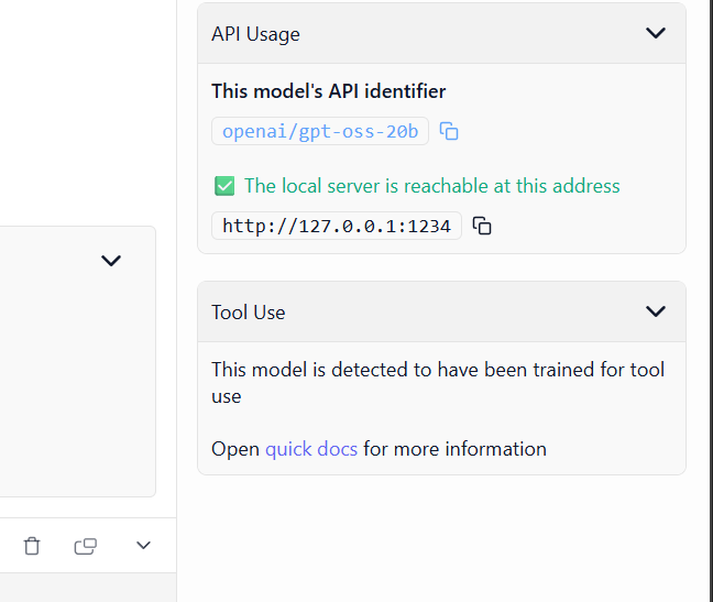 次はLM Studioの側にあるAPI Usageに現在使用してるモデルとServerのIPアドレスが表示されます。その設定は後ほどVS Codeに使われます。