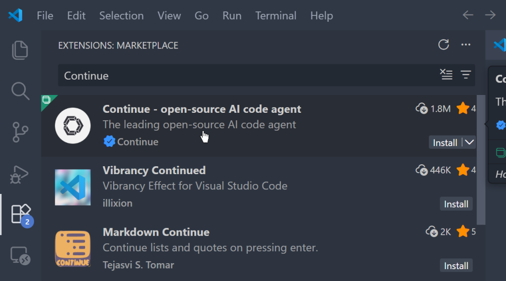 最初にVS Code側にContinue のPlug-insをインストールします。