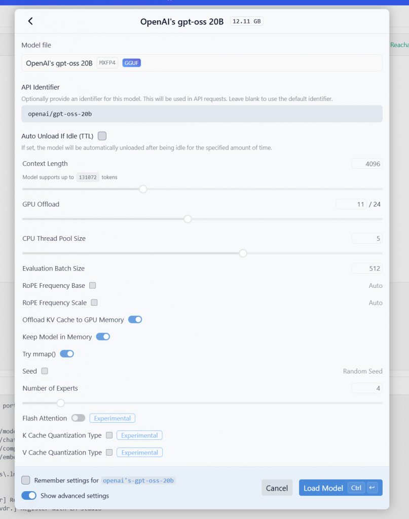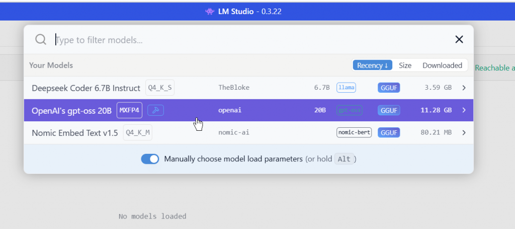 LM studioから起動するモデルを選択します。今回の記事では12GBくらいあるのgpt-oss 20Bに使用します。