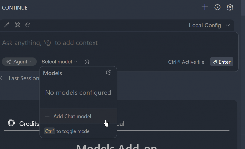 Continue Pluginの設定画面を開き、今回記事で使用するLM StudioのLocal サーバと接続する設定を行います。