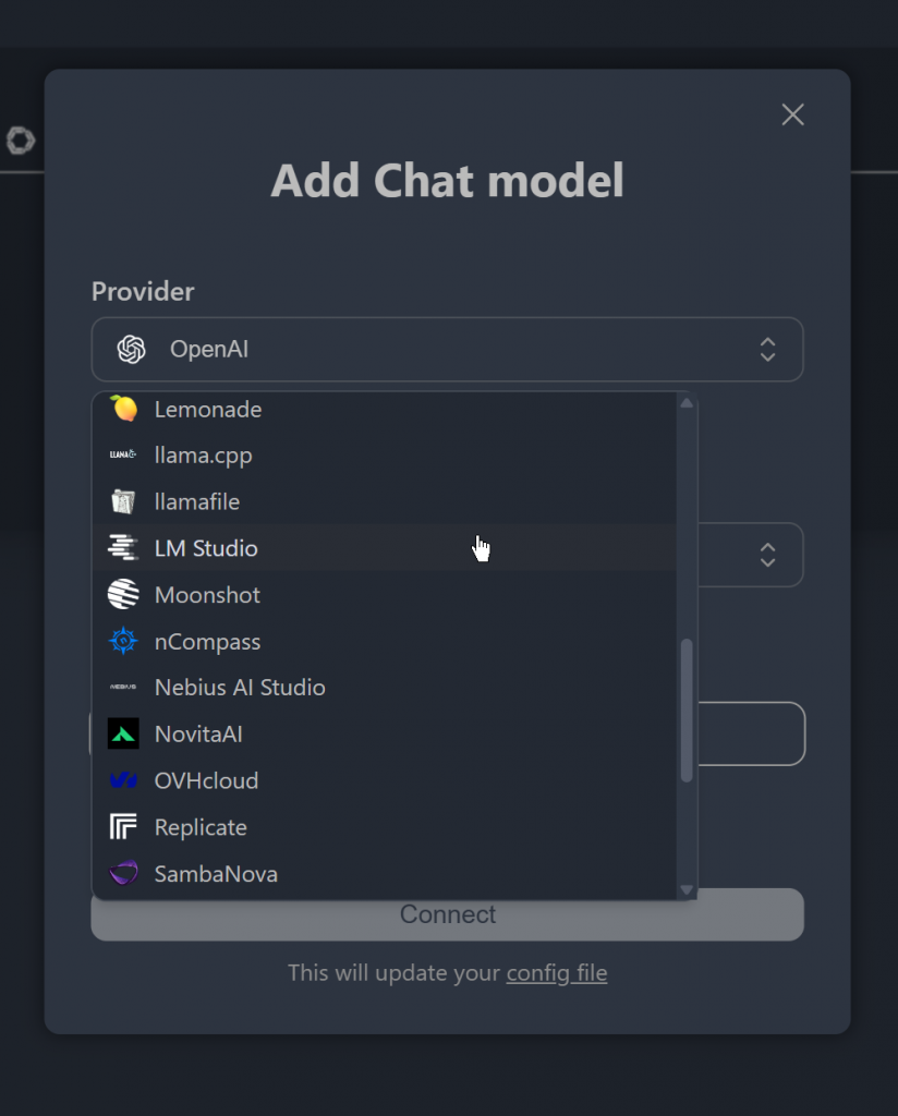 次はモデルの設定Drop-listからLM Studioで使用してるモデルを設定します。