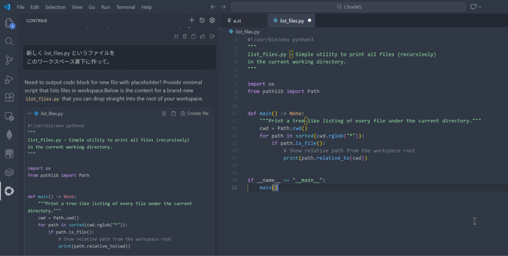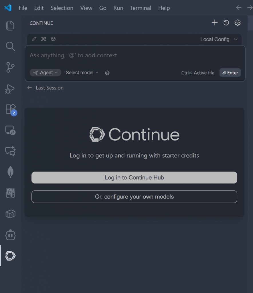 VS Continue Pluginは、ひと言で言うと,、「エディタの中に“会話できる頭脳”を住まわせるためのVS Code拡張」です。Continueは VS Code内で動くAIコーディングアシスタントで、ChatGPT系やローカルLLMとつながり、次のことができます。