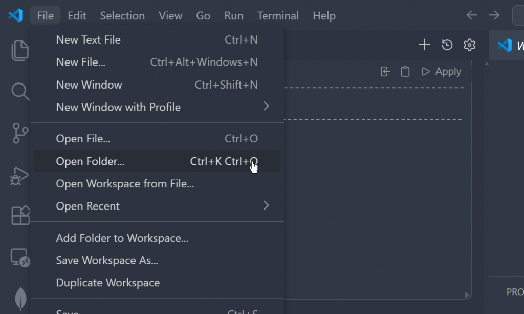 最後はそのコードをテキストとして出力したいので、File→Open Folderで作業するFolderを開きます。