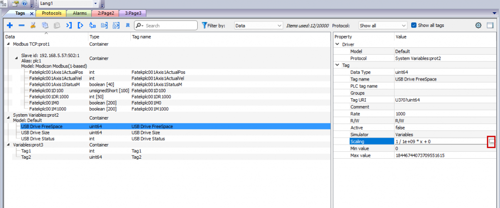 EXORのJMOBILE RUNTIMEからアクセスするUSB変数はByte単位なので、Scalingを設定しBytes→GBに変換します。