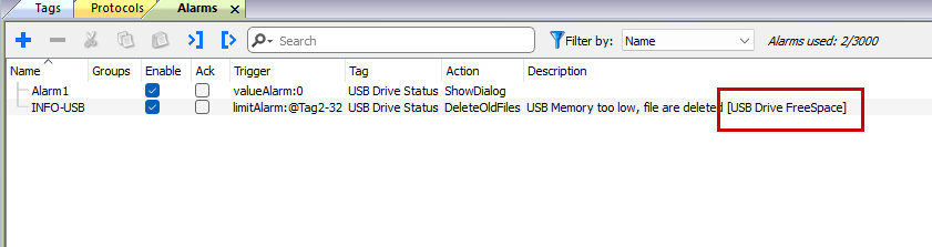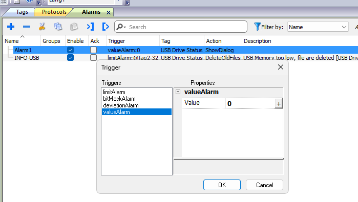 こちらはUSBメモリが抜かれたときのアラーム設定です。valueAlarmに設定し、Trigger値を0にします。