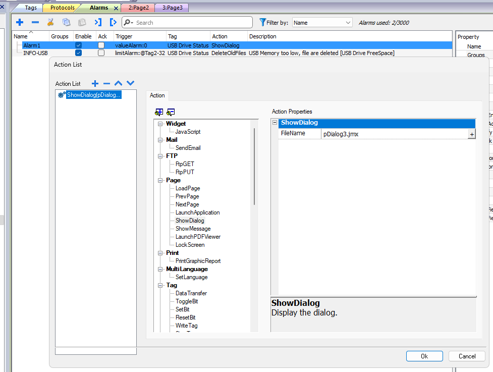 次はAlarmが発生したとき、ActionにShowDialogのイベントを追加します。