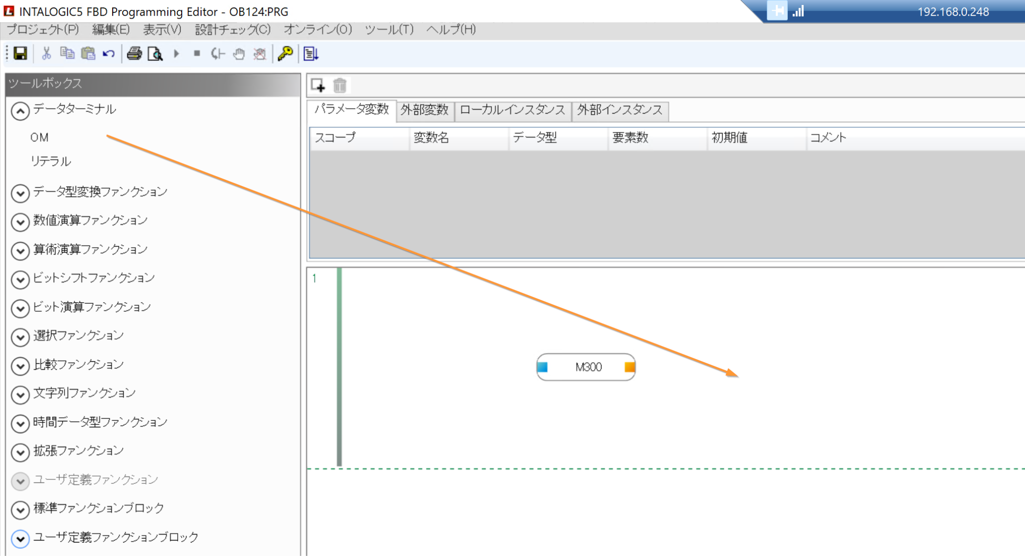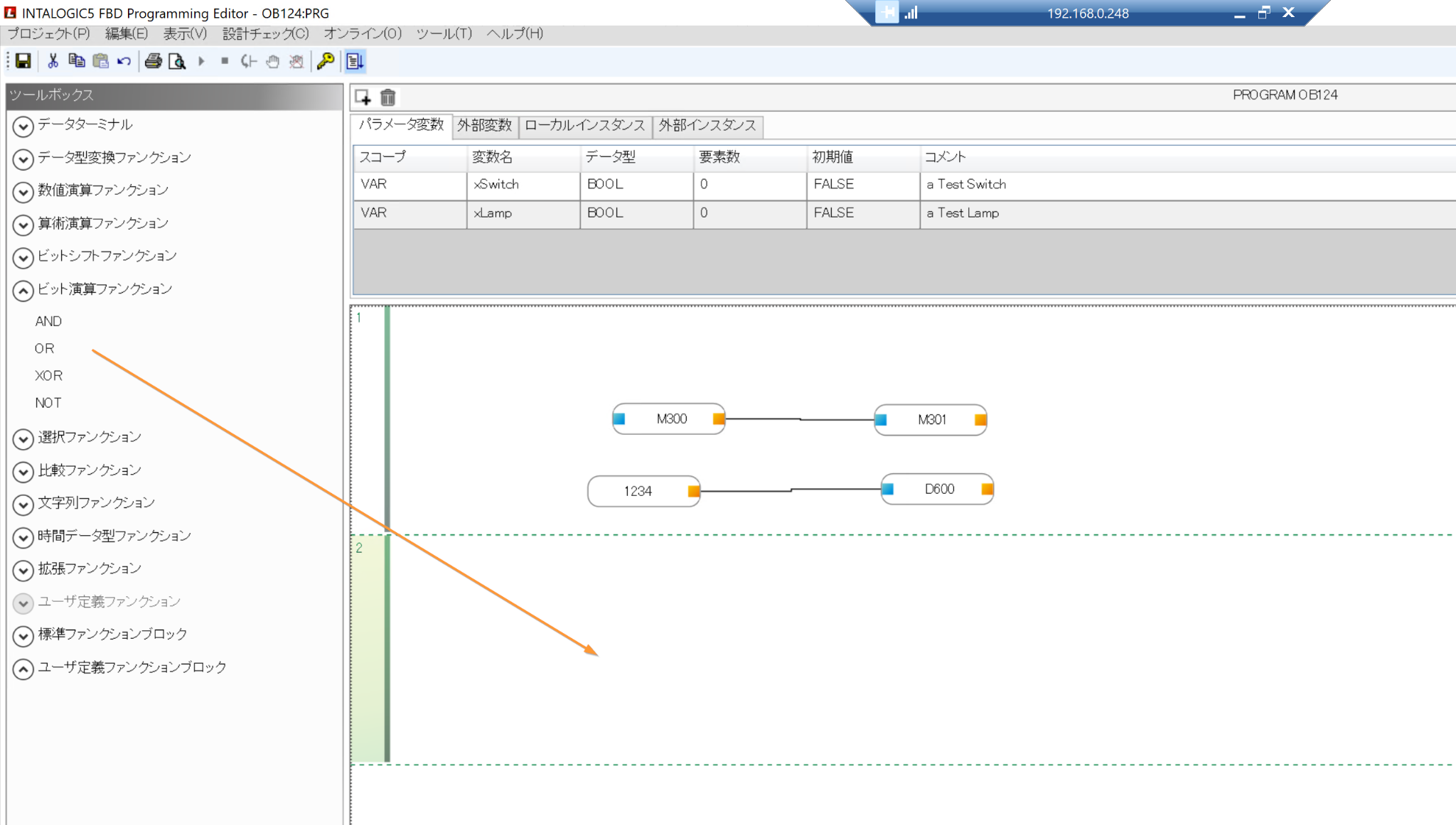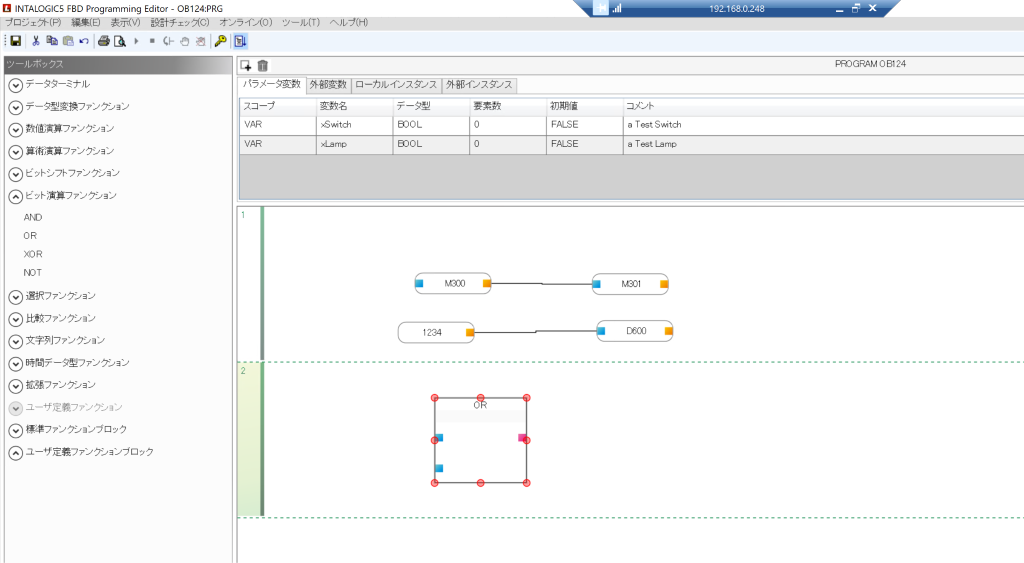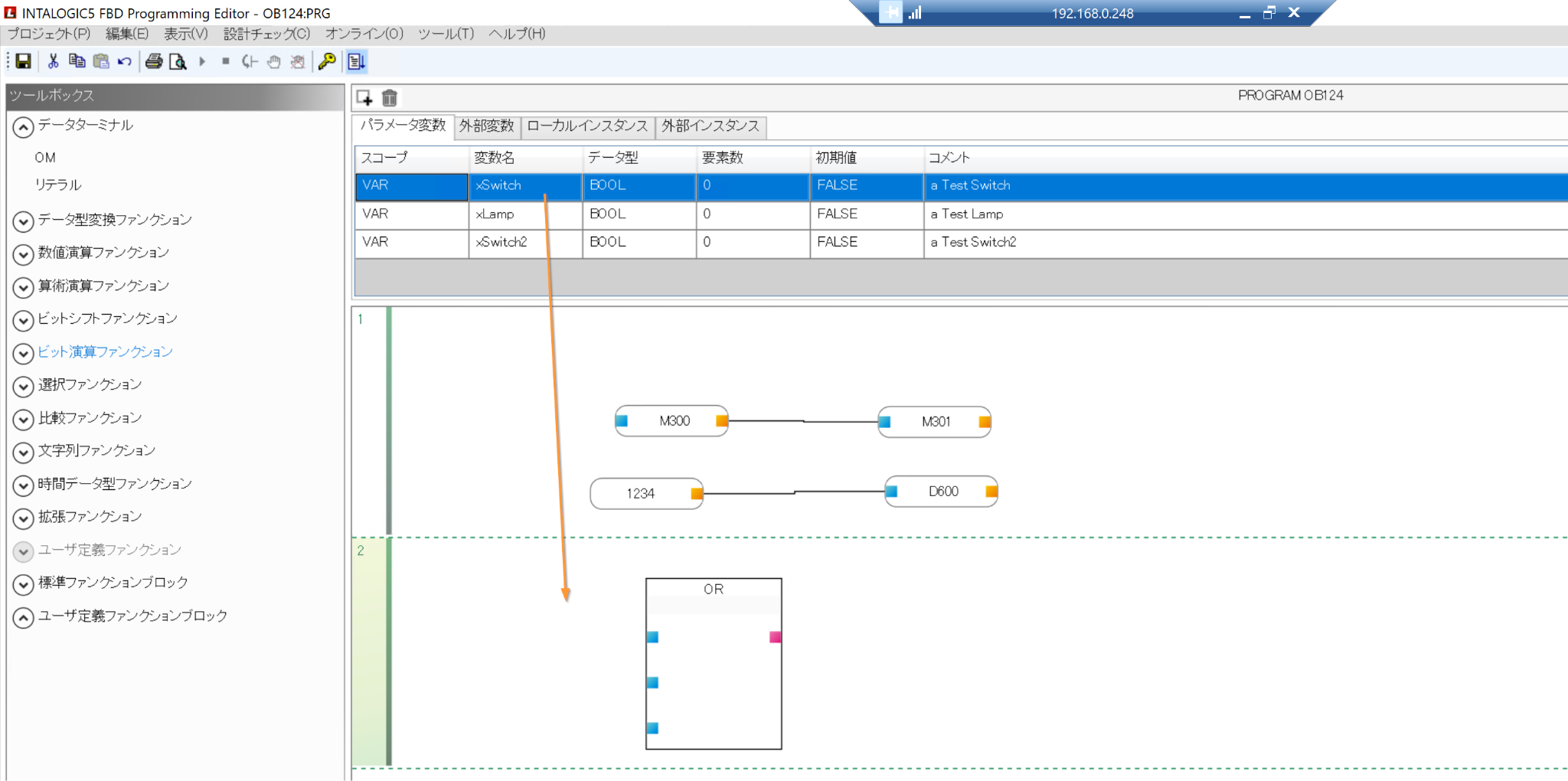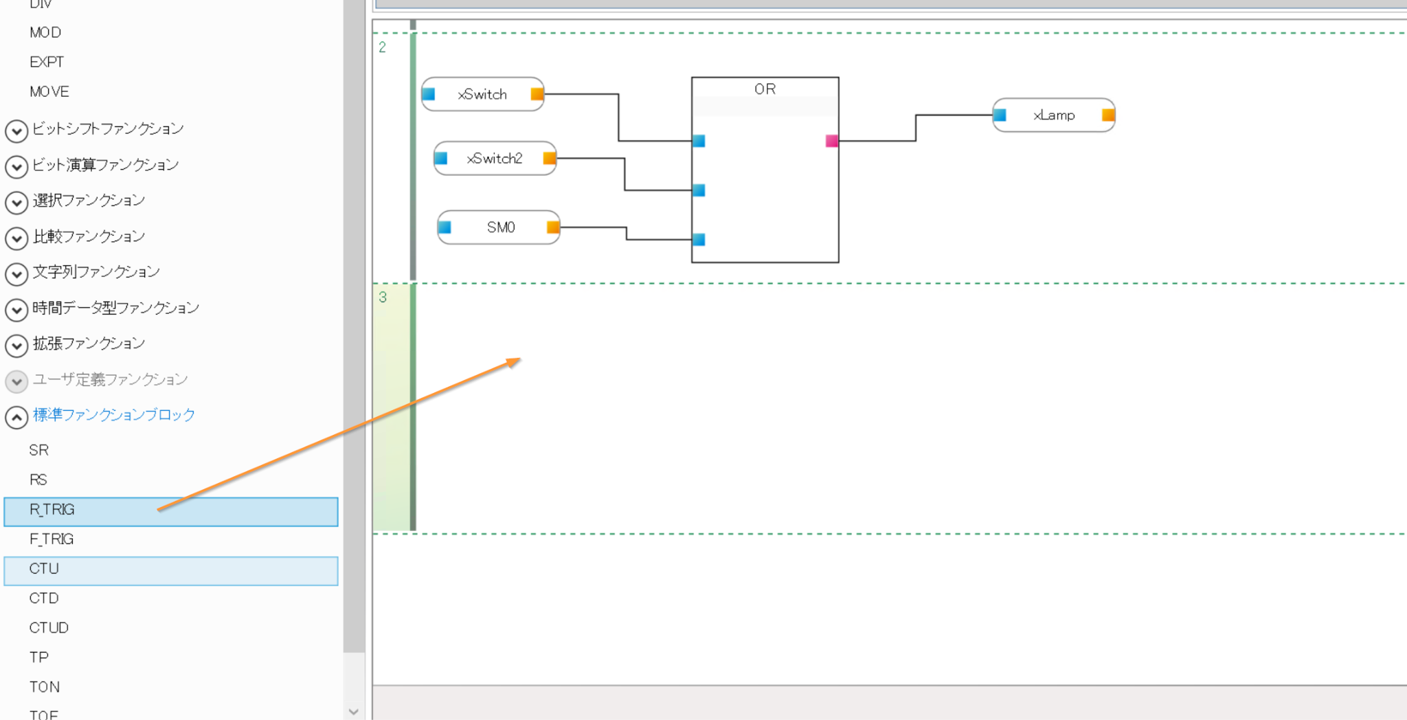 次はFBDで汎用ファンクションを使ってみましょう。ビット演算ファンクションをからORファンクションを追加します。