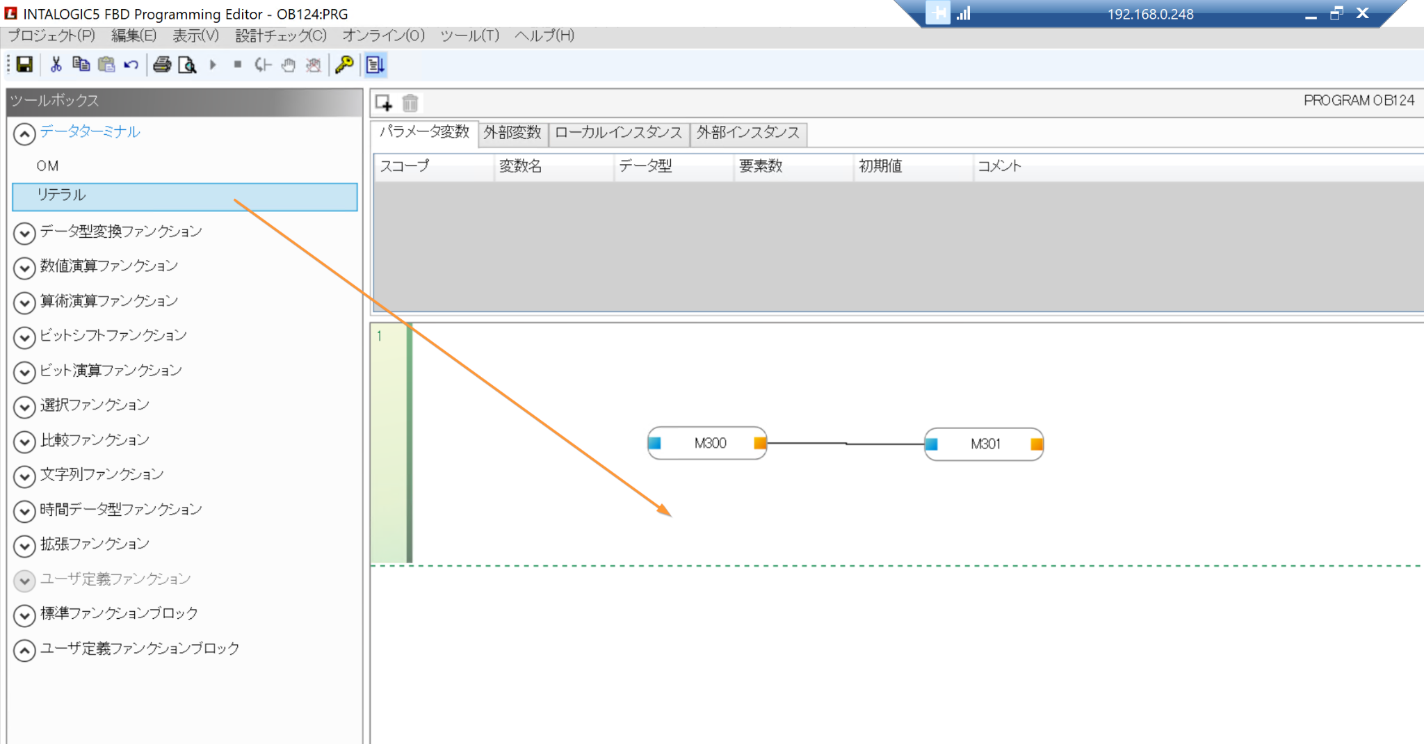 もちろんFBDはラダーにも同じく定数を別のデバイスに転送できます。その場合はデータターミナル→リテラルを選択し、ネットワークにDropします。