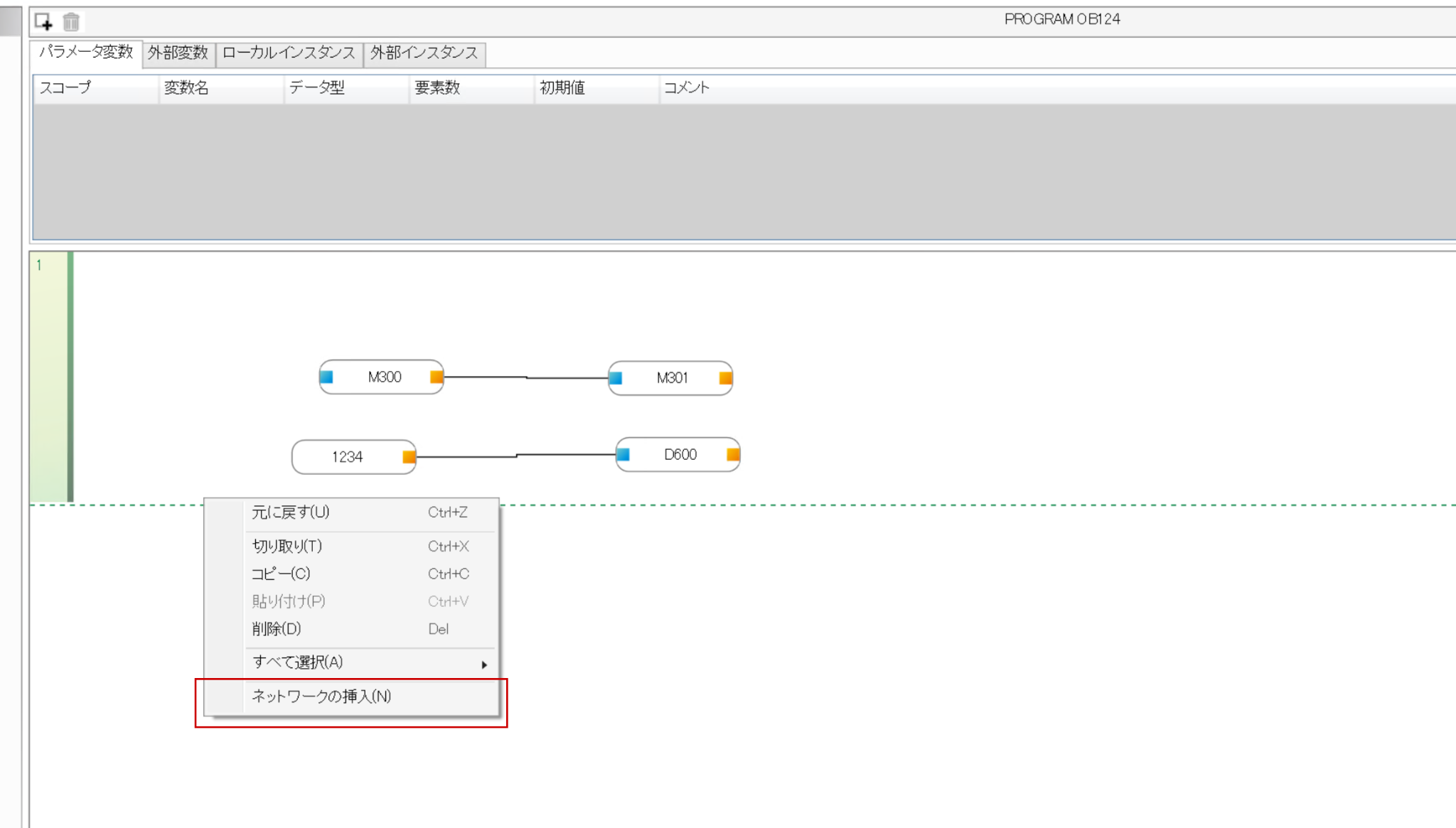 次はFBDプログラムでローカル変数を使ってみます。まず回路の余白のところに右クリック→ネットワークを挿入します。