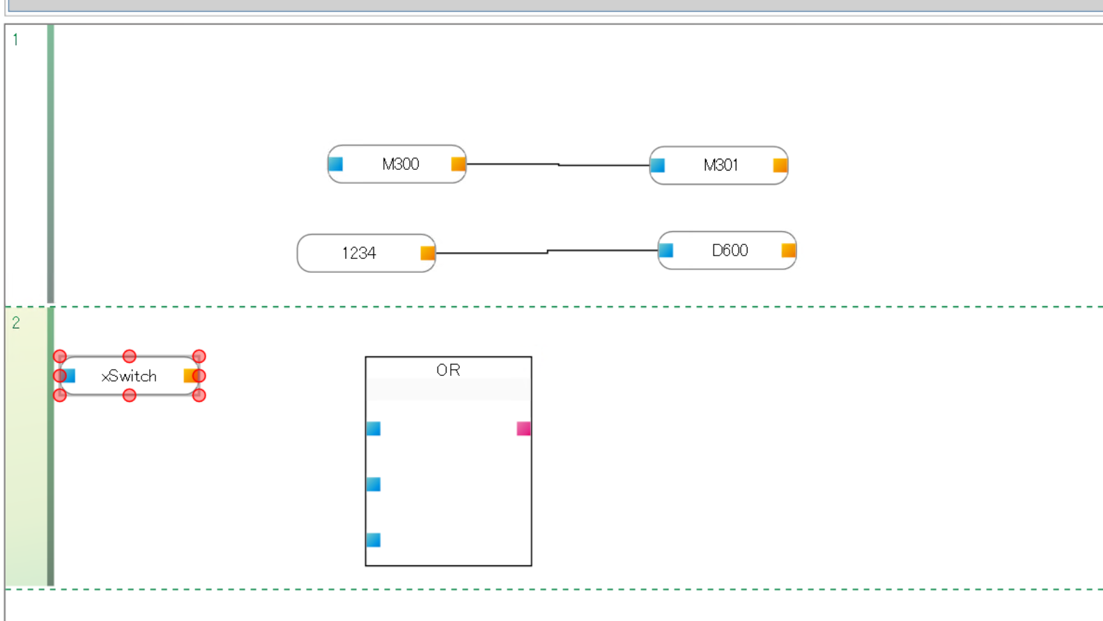 下図のようにM300のオレンジ四角とM301の青い四角をつなげて行きましょう。