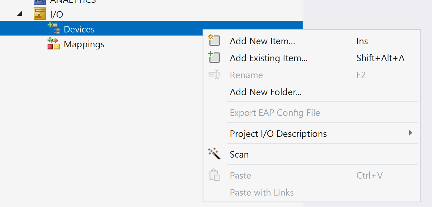 TwinCATプロジェクトの「I/O」ツリー上で右クリックし、コンテキストメニューから「Add New Item…」を選択することで、新しいI/Oデバイス(EtherCAT Masterなど)を手動で追加することができます。