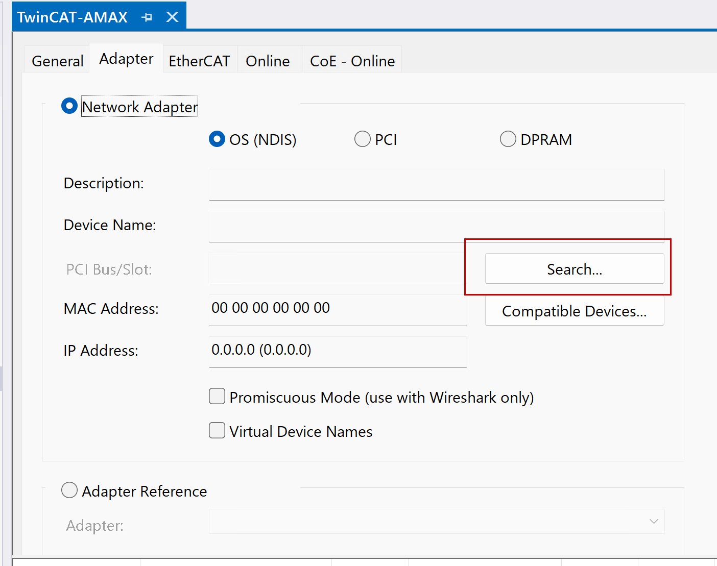 赤枠で囲まれた 「Search…」ボタン をクリックして、システム上の利用可能なEtherCAT対応ネットワークアダプターを検索・選択します。