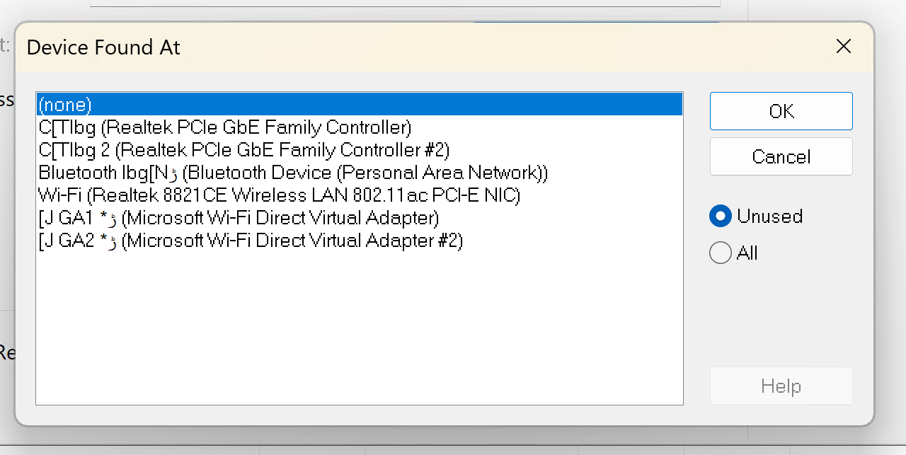 「Search…」ボタンをクリック後に表示される、システム上で検出されたネットワークアダプターの一覧画面です。その中に適切なネットワークアダプターを選択します。