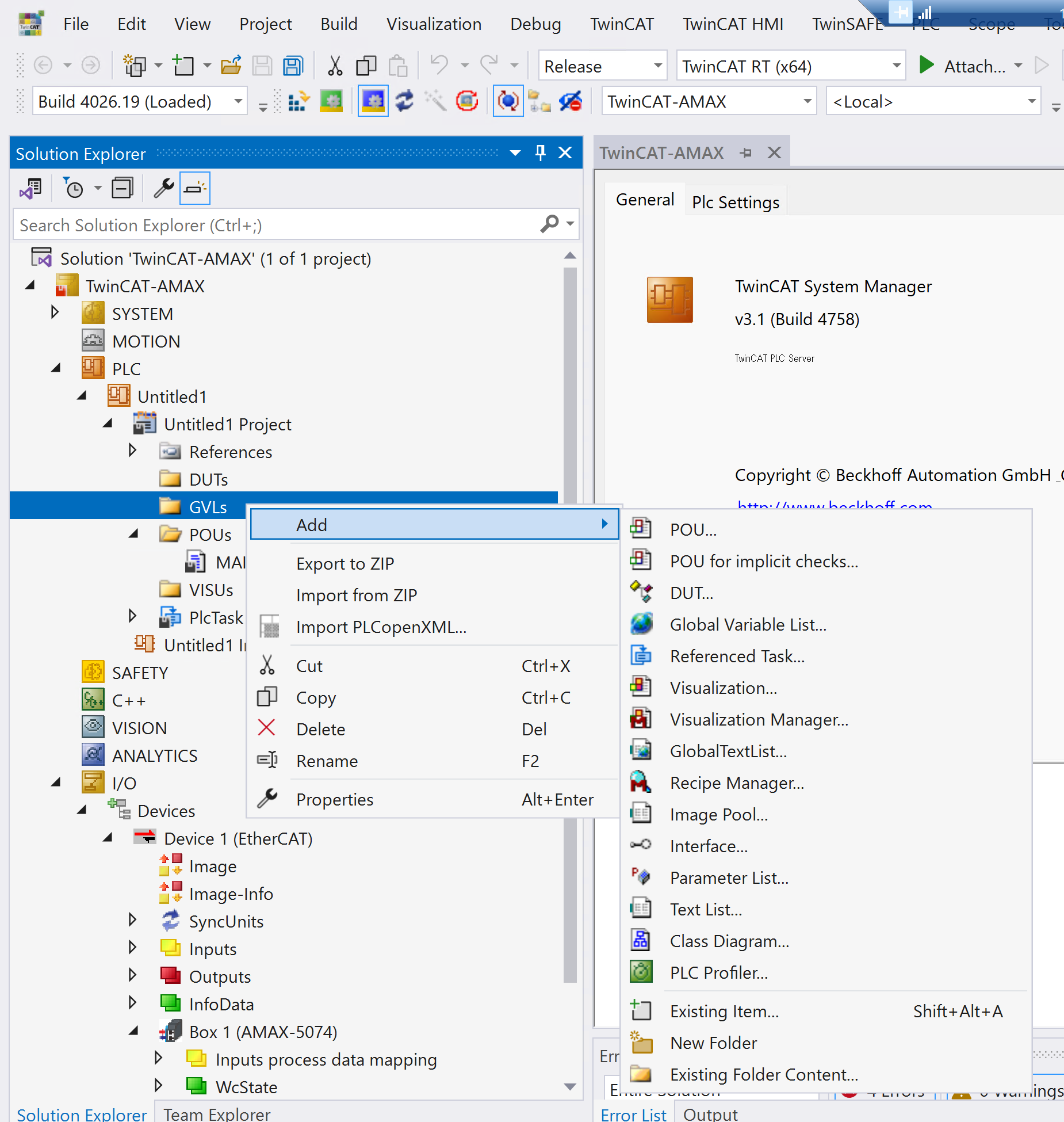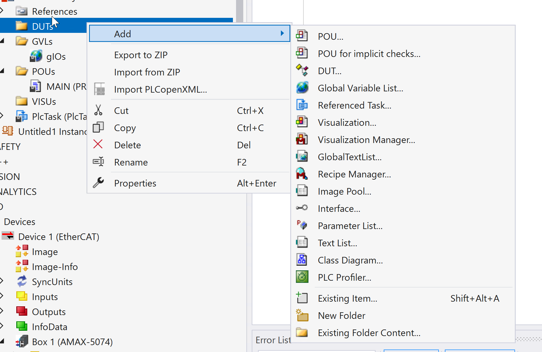Global Variables Listを追加します。GVLs→右クリック→Add→Global Variables Listします。
