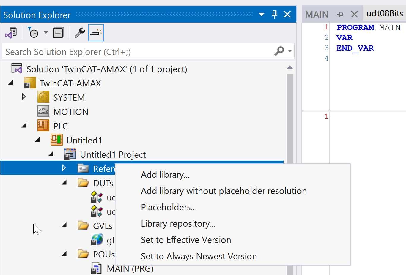 Tc2_EtherCATライブラリを使用したいのでReferences→右クリック→Add libraryします。