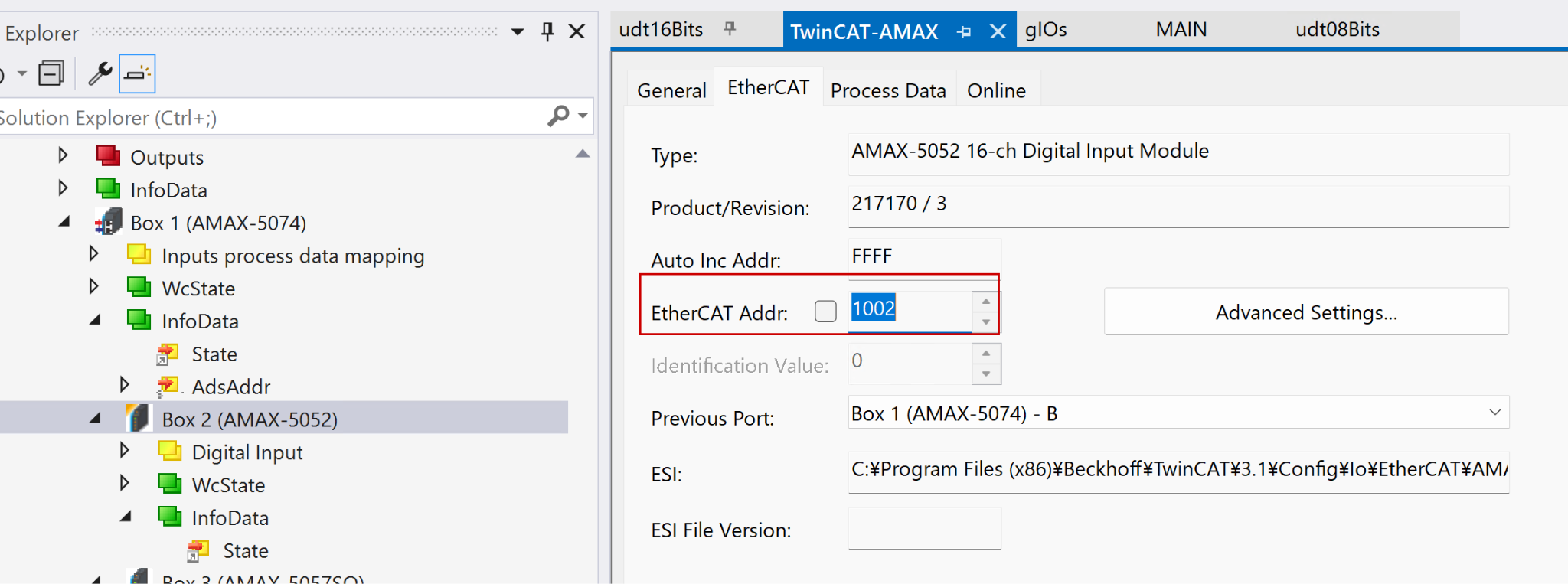 Devies→EtherCAT→NetIdから確認できます。今回の例では1002がINPUTモジュールです。