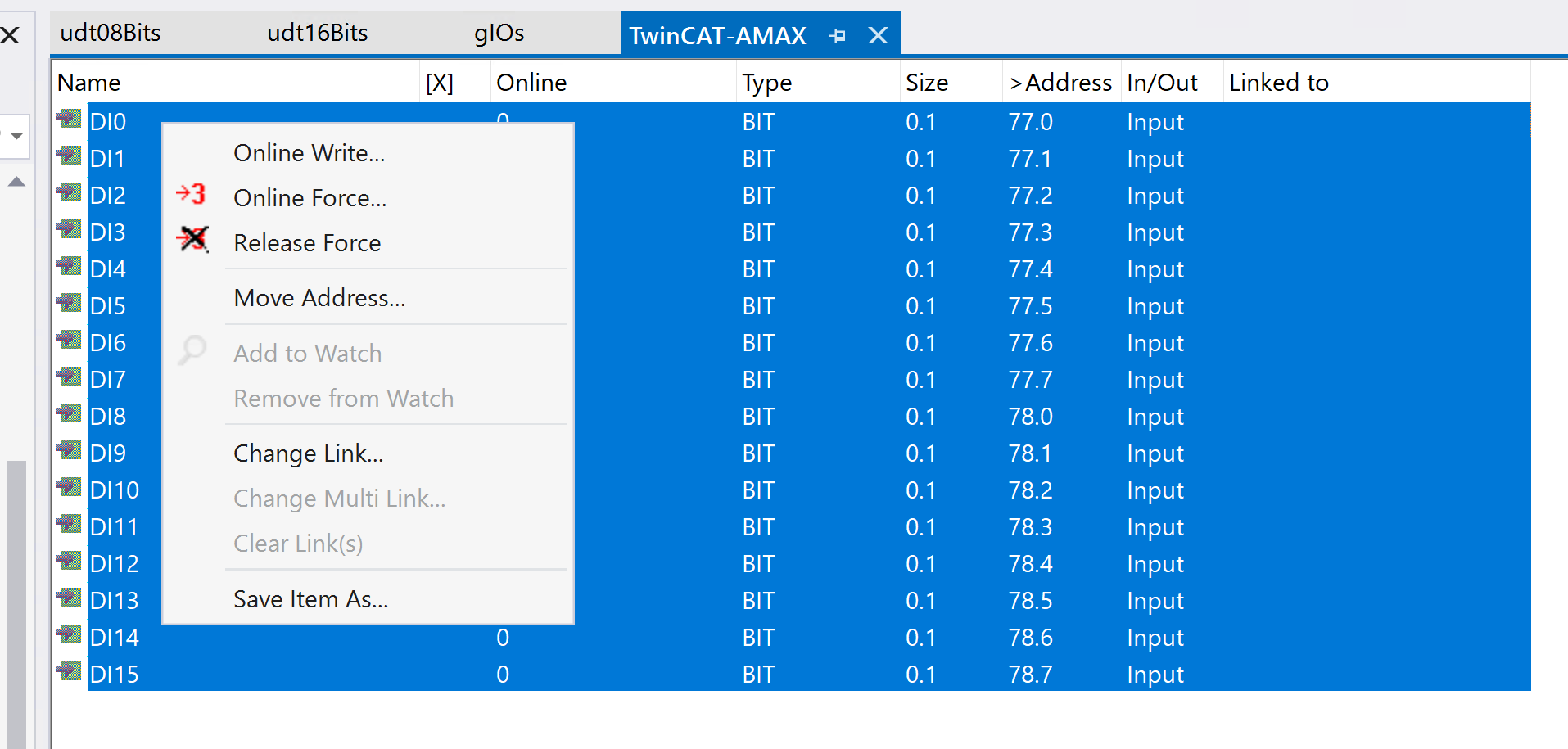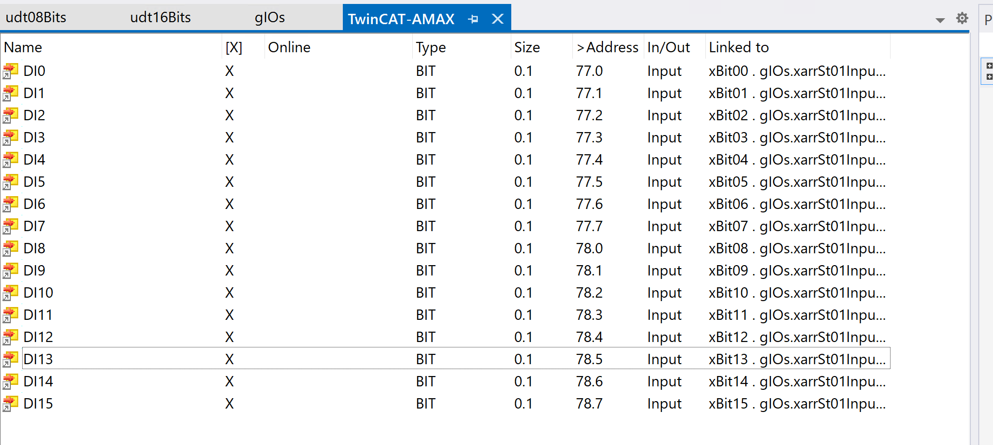 こちらは16ビット(2バイト)のデータを個別のビットとしてアクセスするためのユーザー定義データ型(UDT)です。