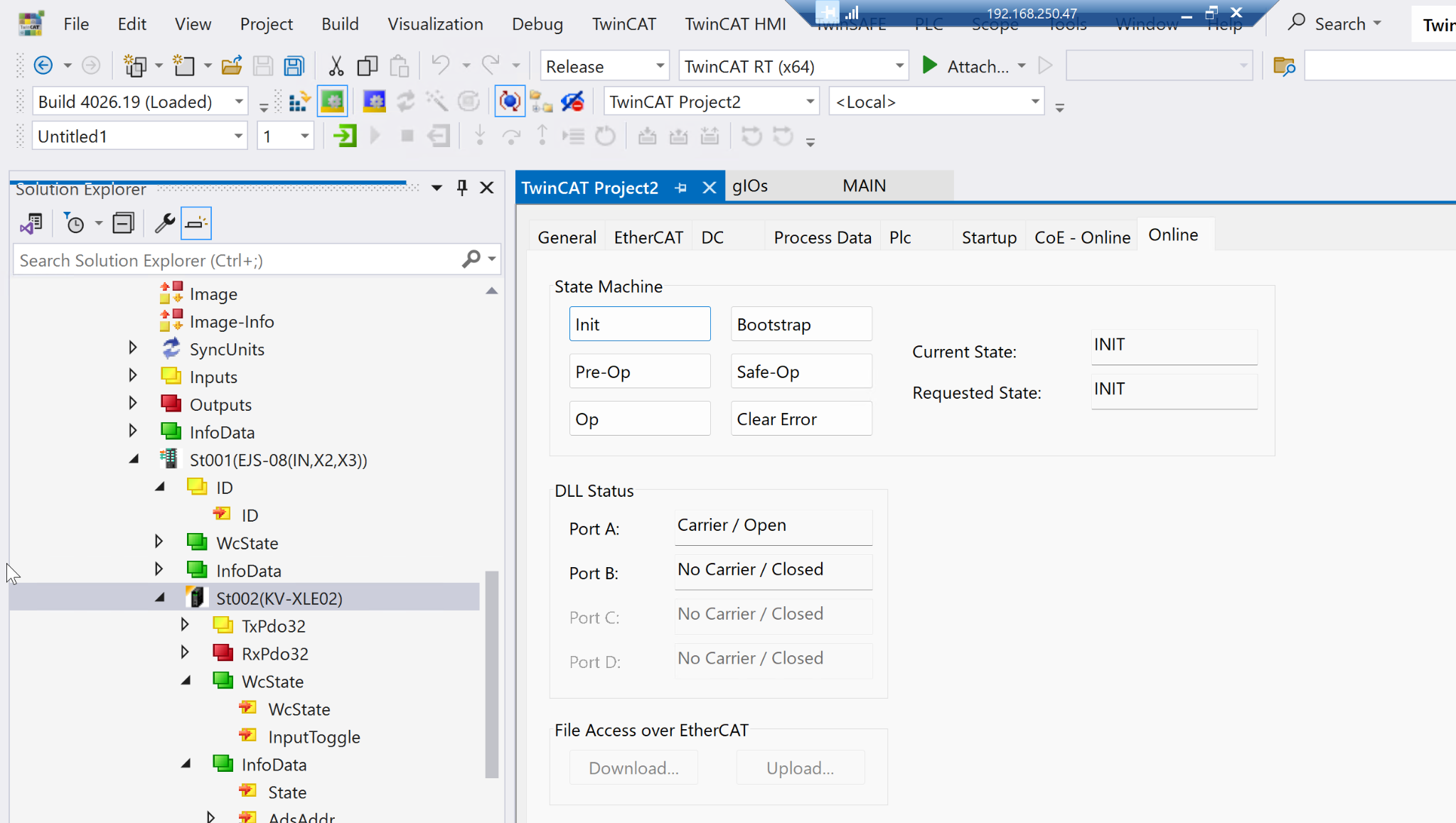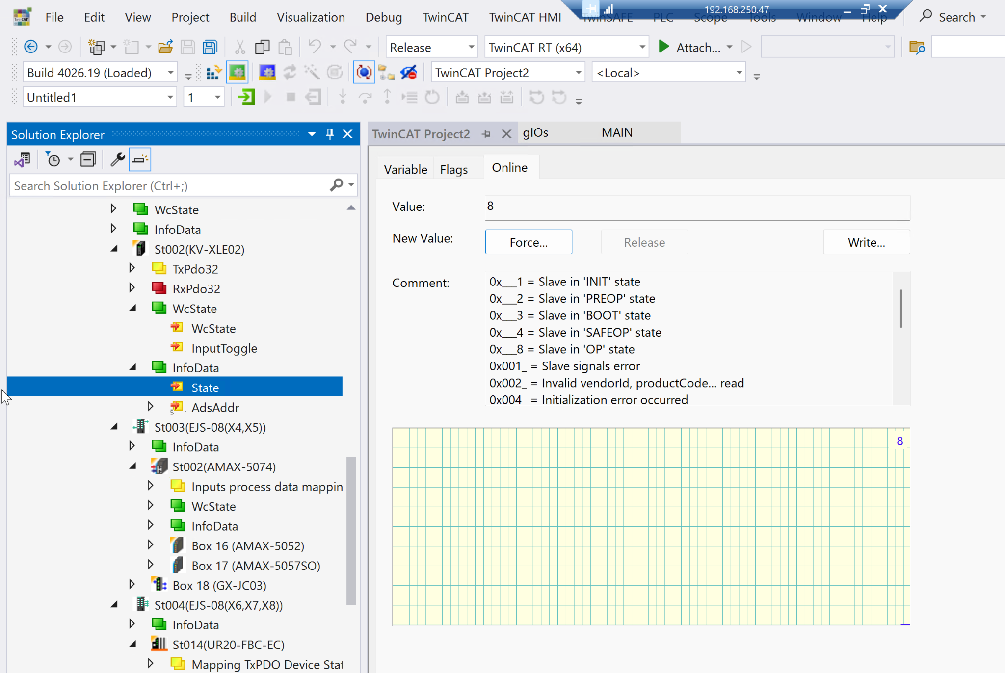TwinCATのEtherCAT構成と実際XLE-02と同じIDなら、KV-XLE02の状態=8、つまりOP状態に遷移しました。