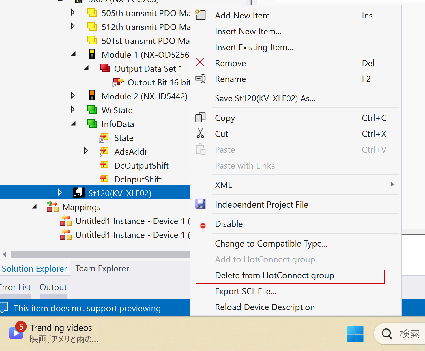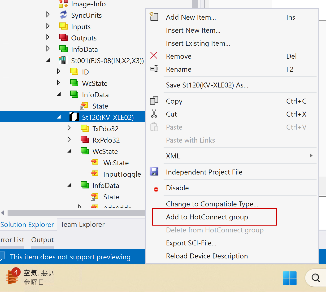 もし該当するEtherCAT スレーブをHot Connect Groupから削除したい場合は、そのEtherCAT Slaveを右クリック→Delete from Hot Connect groupします。