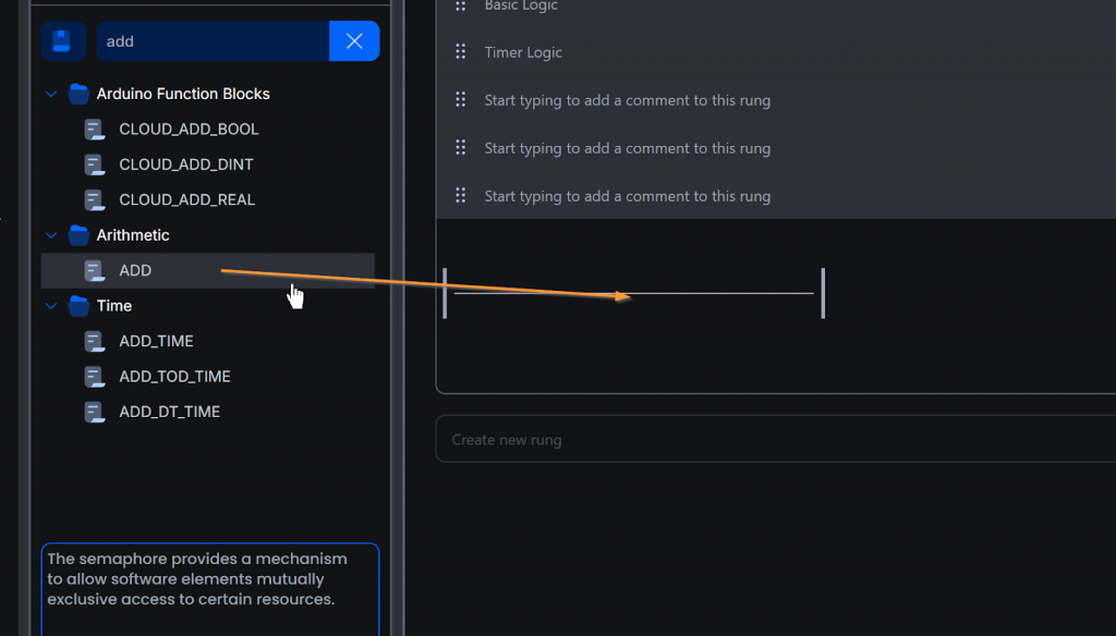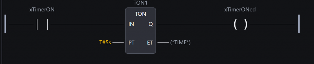 今度はIECタイマーを使用します。下図に示しているBlockをRungに追加しましょう。