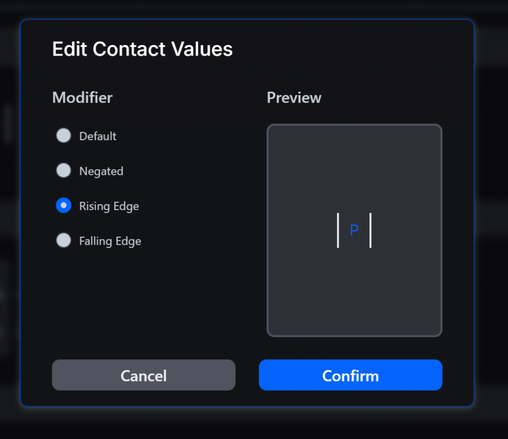 接点タイプの設定画面が表示され、Rising Edgeを設定し、Comfirmします。