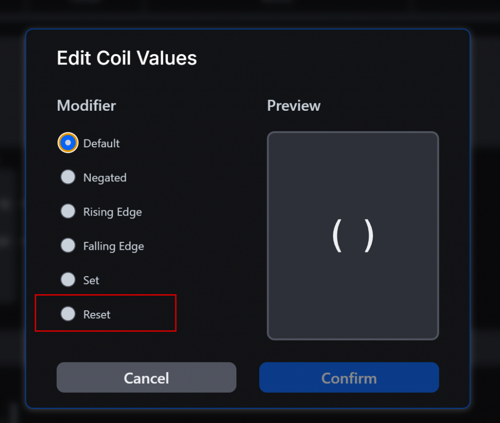 先程追加したコイルをダブルクリックし、”Reset”を選択し、Confirmします。
