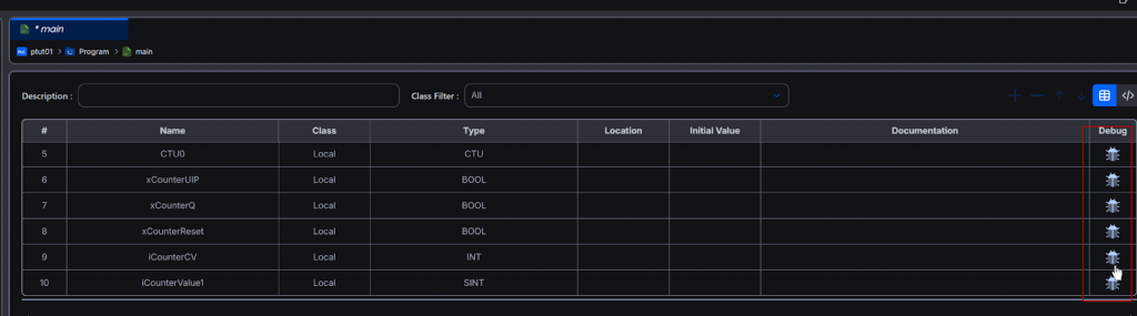 ラダー図ではBool変数そのままTrue/Falseで確認できますが、それ以外の変数をモニタリングすることも可能です。変数の宣言部にはDebugというボタンがあり、モニタリングしたい変数をクリックします。