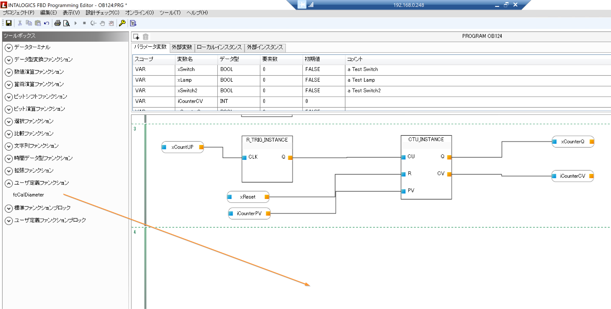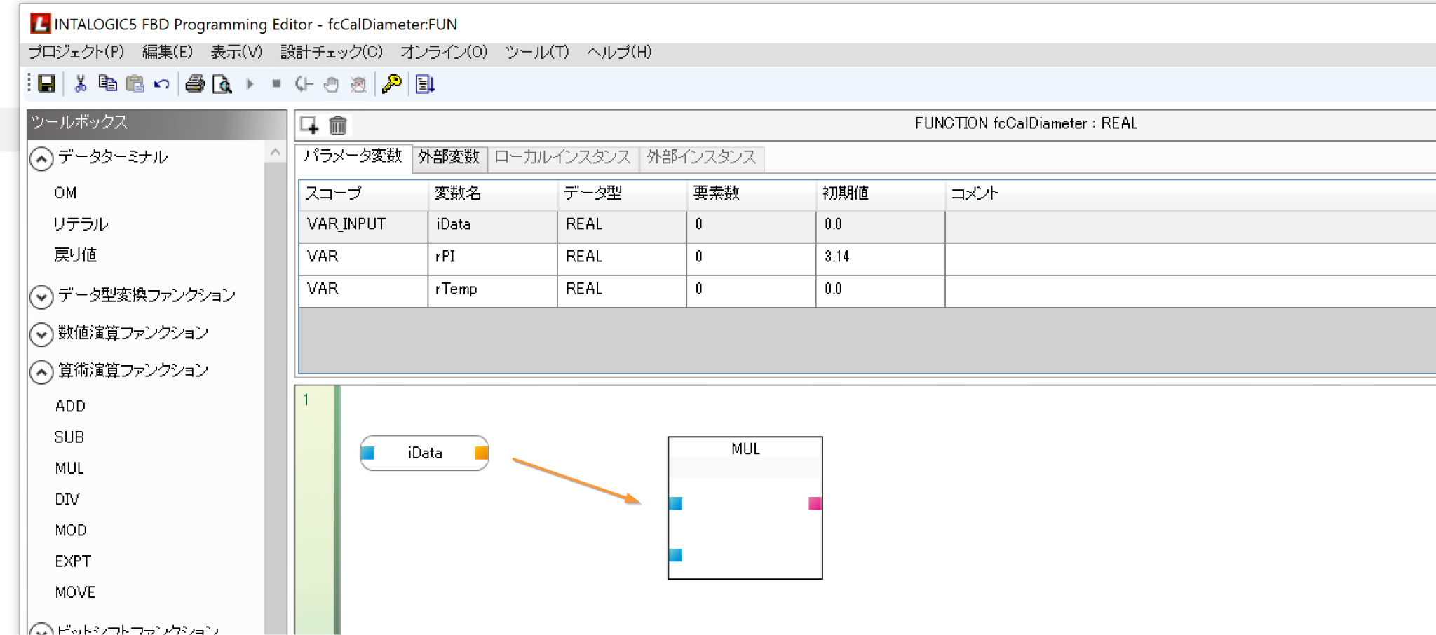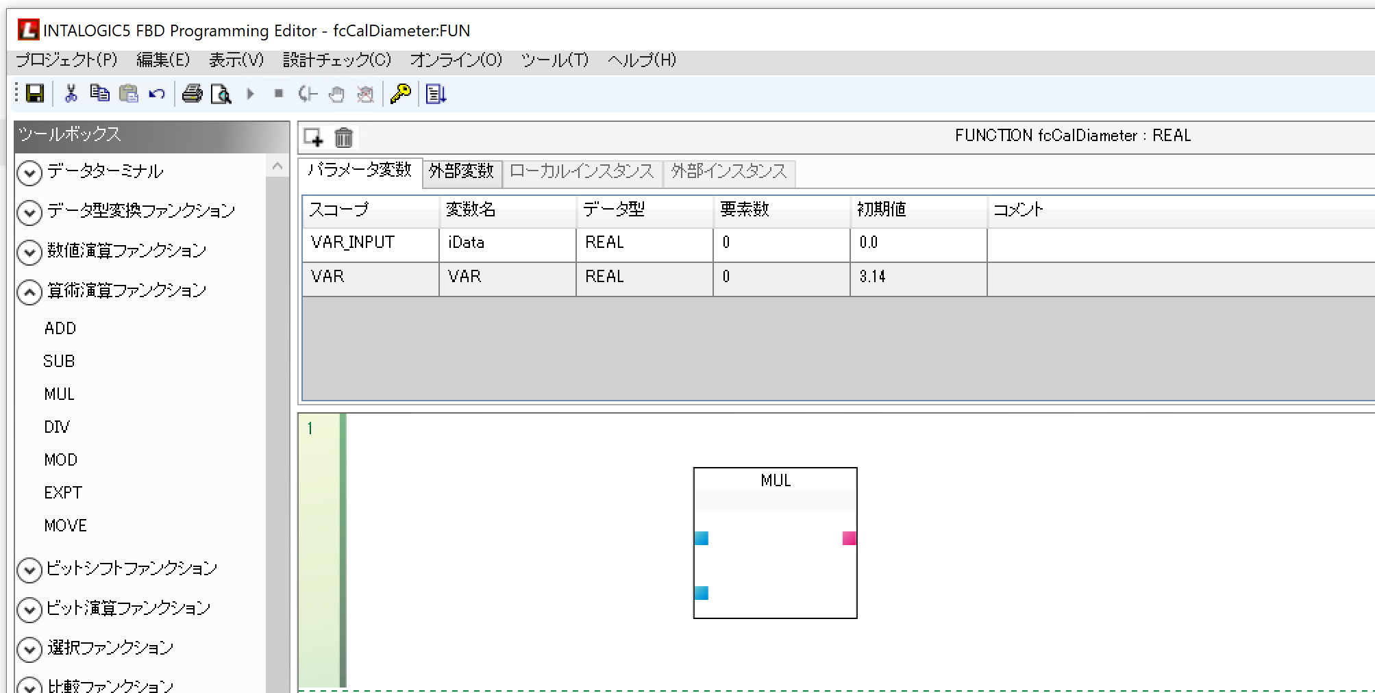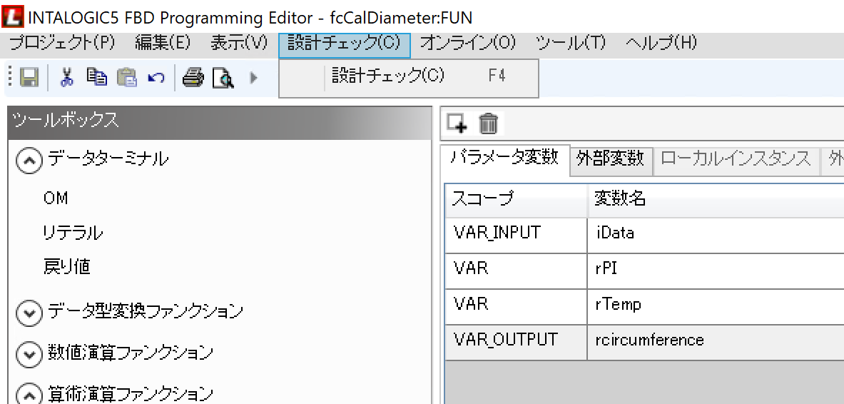 次は先程作成したファンクションをFBDプログラムから呼び出してみましょう。